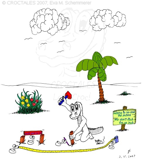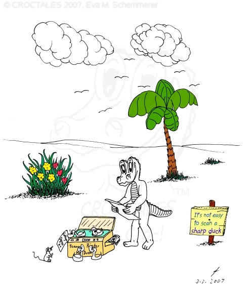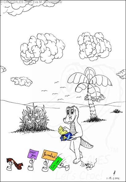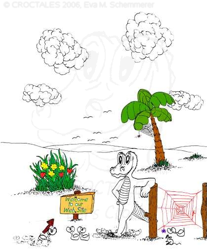 CROCTALES - Let's Croc! Your South-Florida comic for the young and the young at heart. Starring: CROC the alligator, four little orphan ducks and the Cookie-Mouse, of course with lots of guests and visitors; snowbirds included. With CROC philosophy & advice including our own version of online banking and daylight saving, our personal donut & diet site, a new learning site for kids and a new book "ABC learn the CROCTALES alphabet", our EconCOMICAL task force, the LITTLE GREEN PLANET series, a trip around the world, Florida snap shots, croc history & evolution, funny weather reports, lots of duck talk, classifieds & jobs, a wild goose/duck chase, sports & events including GOLFING, the Super Bowl and much, much more. Croc's story & adventures. Cartoon ducks in action. The shy Cookie-Mouse learning something new, not just English and new words but interesting facts about Italy, Florida, the FL state fruit: orange and how kids can make a difference. Croc's comic archives, ducks can('t) spell - go figure, word games, reading between the lines, a little Italian and German and even Chinese. Have fun! THANK YOU for stopping by- Let's Croc!CROCTALES - Lets Croc - DAS Florida Comic für junge und jung gebliebene, mit einem Alligator namens Croc, vier frechen Enten und der schüchternen Cookie-Maus. VIEL SPASS bei unserer Version von Online-Banking, der EconComical Task Force, der neuen CROCTALES for KIDS Lernseite, der Serie über unseren kleinen grünen Planeten - our little green planet - mit Raumfahrt Comics und einer Lösung für die Probleme mit dem WC in der ISS, Astrologie, neue Sternbilder, unsere nicht ganz ernst zu nehmenden Diät Vorschläge, CROCTALES Geschichte & Evolution, Florida Wetter, Hurrikane und Tornados, Kummerkasten und Ratschläge der etwas anderen Art, Sport & Events, Spaß für Golfer, Football und der Super Bowl, CROC Philosophie und sonstiger Unsinn. VIEL SPASS und LETS CROC!