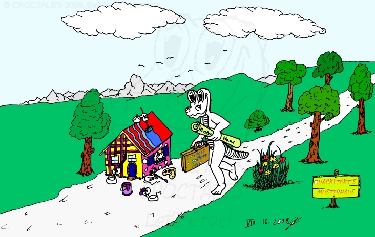 Mittlerweile gibt es auch ein paar deutsche CROCTALES Bilder, wie das nachstehende Musterhaus; die internationale Golfersprache "Tee-Time" oder auch die freundliche Einlandung "Ihr könnt mir 'mal den Buckel 'runter rutschen"... (zum Vergrößern der Bilder einfach die Miniatur anlicken; die Vergrößerung kann nochmal vergrößert werden, indem Ihr die linke untere Ecke anklickt) Auf der Seite CROCTALES History and Evolution findet Ihr einige frühe CROCTALES Zeichnungen. Mehr als 700 Bilder wurden schon vollständig digital überarbeitet, doch die meisten sind noch im Urzustand. Alles in allem gibt es mittlerweile mehr als 2.000 CROCTALES Bilder. Einen festen Plan gibt es nicht. Manchmal läuft die Tinte einfach davon und die CROCTALES entwickeln ein Eigenleben.... man weiß nie, was sie als nächstes aushecken! Die CROCTALES sind mit Tinte und einem