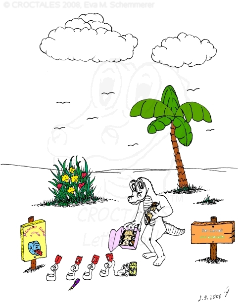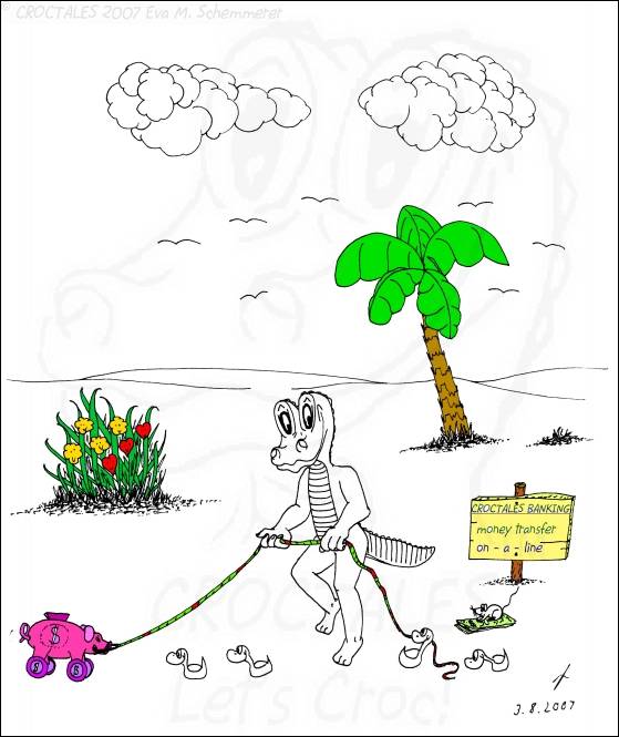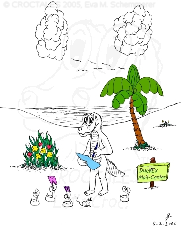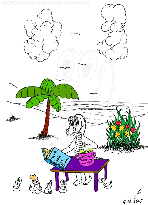 CROCTALES - Let's Croc! Your South-Florida comic for the young and the young at heart. Starring: CROC the alligator, four little orphan ducks and the Cookie-Mouse, of course with lots of guests and visitors; snowbirds included. With CROC philosophy & advice including our own version of online banking and daylight saving, our personal donut & diet site, a new learning site for kids and a new book "ABC learn the CROCTALES alphabet", our EconCOMICAL task force, the LITTLE GREEN PLANET series, a trip around the world, Florida snap shots, croc history & evolution, funny weather reports, lots of duck talk, classifieds & jobs, a wild goose/duck chase, sports & events including GOLFING, the Super Bowl and much, much more. Croc's story & adventures. Cartoon ducks in action. The shy Cookie-Mouse learning something new, not just English and new words but interesting facts about Italy, Florida, the FL state fruit: orange and how kids can make a difference. Croc's comic archives, ducks can('t) spell - go figure, word games, reading between the lines, a little Italian and German and even Chinese. Have fun! THANK YOU for stopping by- Let's Croc!CROCTALES - Lets Croc - DAS Florida Comic für junge und jung gebliebene, mit einem Alligator namens Croc, vier frechen Enten und der schüchternen Cookie-Maus. VIEL SPASS bei unserer Version von Online-Banking, der EconComical Task Force, der neuen CROCTALES for KIDS Lernseite, der Serie über unseren kleinen grünen Planeten - our little green planet - mit Raumfahrt Comics und einer Lösung für die Probleme mit dem WC in der ISS, Astrologie, neue Sternbilder, unsere nicht ganz ernst zu nehmenden Diät Vorschläge, CROCTALES Geschichte & Evolution, Florida Wetter, Hurrikane und Tornados, Kummerkasten und Ratschläge der etwas anderen Art, Sport & Events, Spaß für Golfer, Football und der Super Bowl, CROC Philosophie und sonstiger Unsinn. VIEL SPASS und LETS CROC!