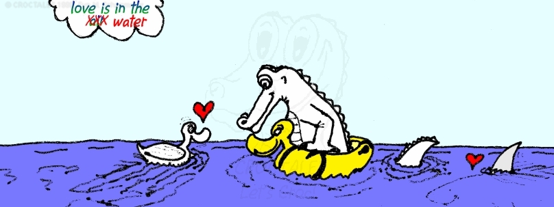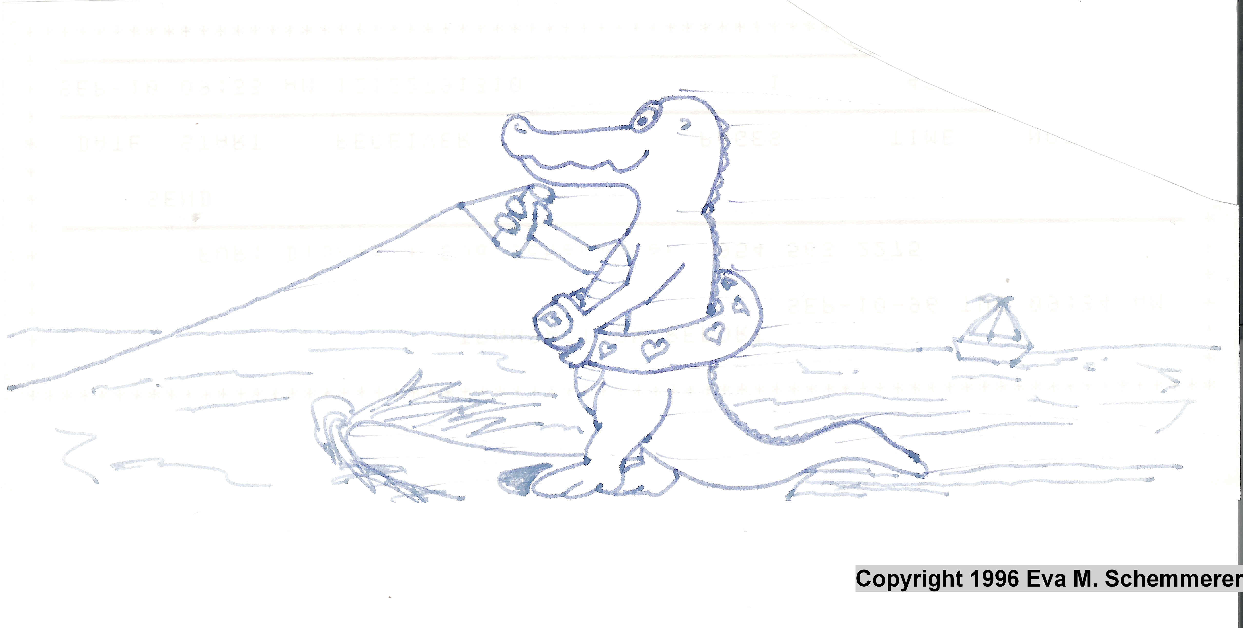 Before the CROCTALES series started, it was little drawings on old fax reports, Croc only. No ducklings and mouse, yet. Blue ink was later replaced by black. Croc had a few extra pounds back then... so did my husband . LOVE is in the water 1996: